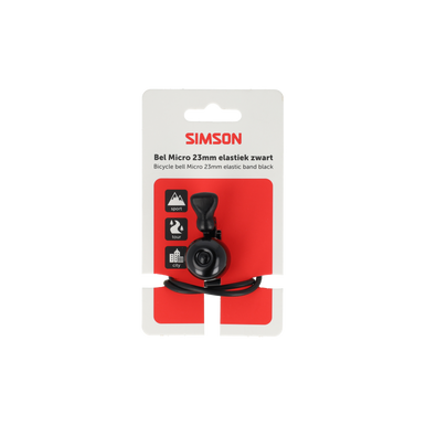 De kleinste bel met het grootste geluid. De Simson Fietsbel Micro is met zijn 23 mm diameter extreem compact, maar verbaast vriend en vijand door de koperen koepel. Koper geeft een opvallend hoge en langdurige toon. De bel is 360 graden draaibaar en kan via de rubberen elastiek-bevestiging op vrijwel elk stuur (ook conische sportsturen) worden geplaatst.