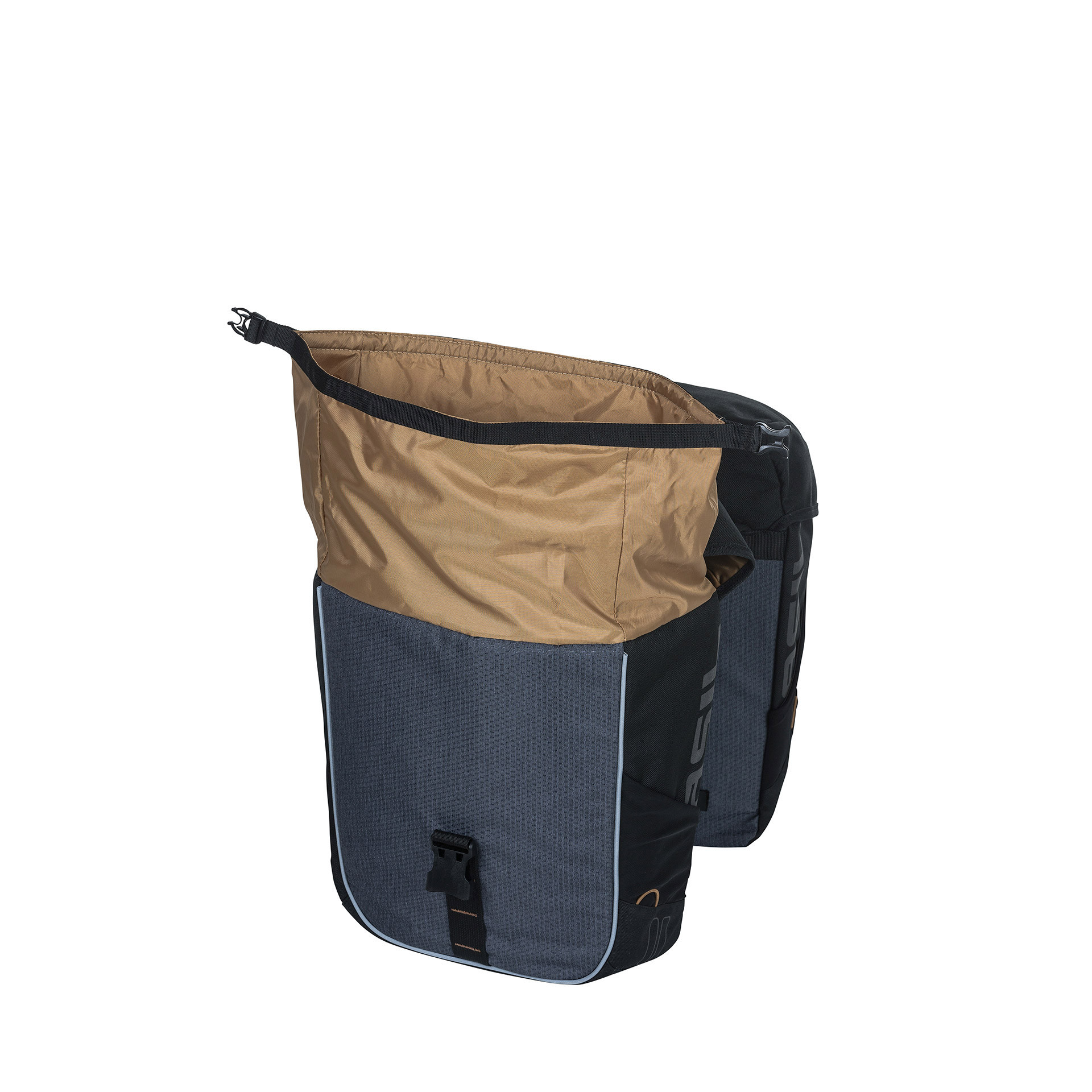 De Basil Miles 34 ltr zwart-grijs dubbele fietstas is een sportieve dubbele fietstas, geschikt voor een dames- en herenfiets. De tassen hebben een totale inhoud van 34 liter en kunnen dus heel wat spullen dragen. De Basil Miles 34 ltr zwart-grijs dubbele fietstas is gemaakt van polyester en heeft een kwalitatieve binnenvoering. Daardoor zijn de tassen heel stevig en sterk. Bovendien zijn ze waterdicht, waardoor de inhoud altijd droog blijft. De tassen sluit je eenvoudig af door middel van een roltopsluiting. De Basil Miles 34 ltr zwart-grijs dubbele fietstas bevestig je aan de bagagedrager met behulp van het Universal Bridge-systeem. Ze zijn er dus ook weer snel en makkelijk af te halen. Verder is de Basil Miles 34 ltr zwart-grijs dubbele fietstas voorzien van lime details en reflecterend materiaal. Er zijn ook lusjes voor lampjes aanwezig, zodat je je ledlampjes altijd probleemloos kunt vastklikken. Op die manier word je goed gezien door andere weggebruikers. Ben je dus op zoek naar een praktische set fietstassen met voldoende inhoud, bijvoorbeeld om boodschappen te doen? Dan is de Basil Miles 34 ltr zwart-grijs dubbele fietstas een echte aanrader. Je kiest hiermee voor een kwalitatieve fietstas die jarenlang meegaat.