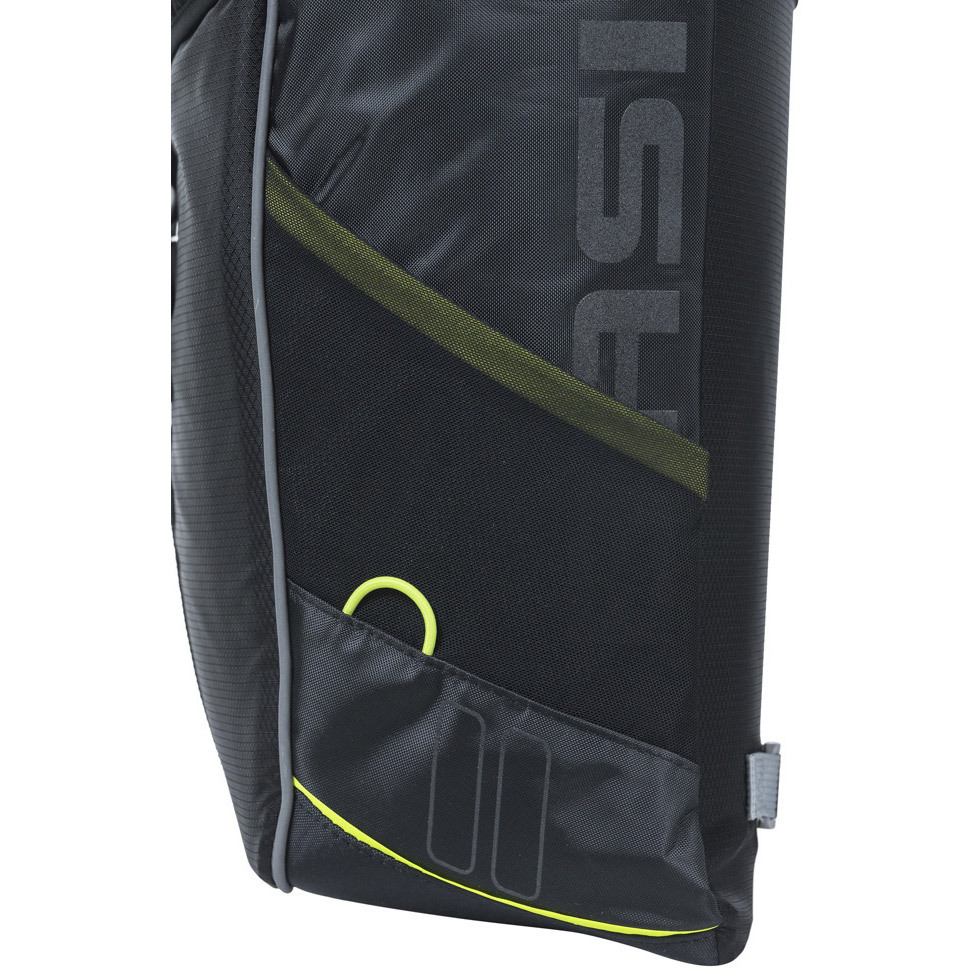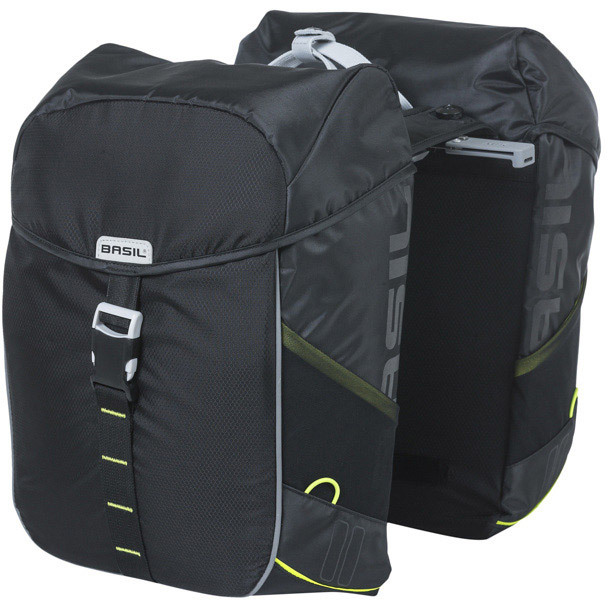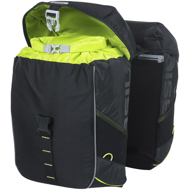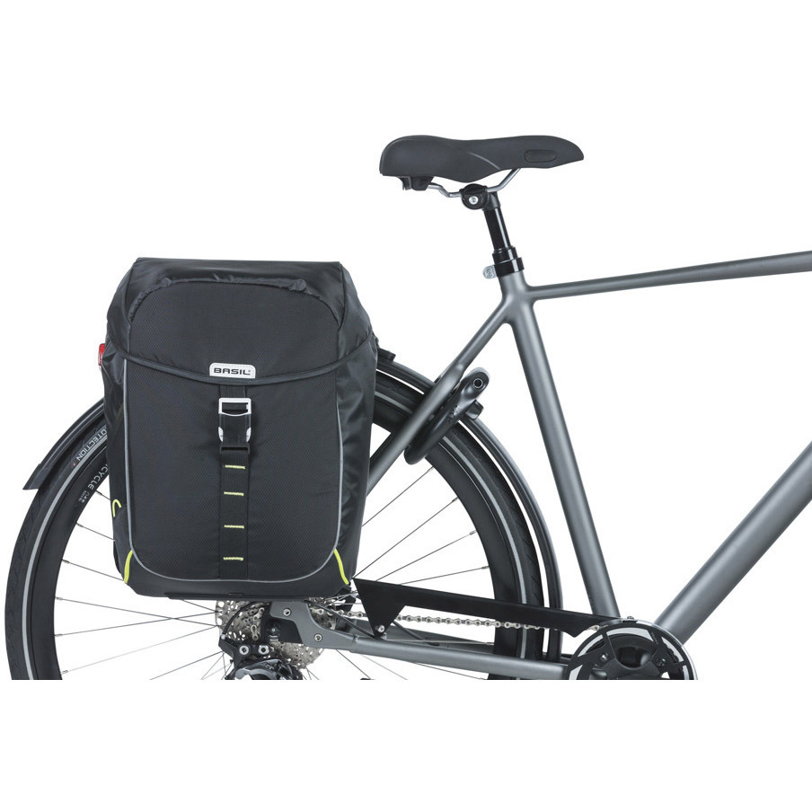 De Basil Miles MIK 34 ltr zwart-lime dubbele fietstas is een sportieve dubbele fietstas, geschikt voor een dames- en herenfiets. De tassen hebben een totale inhoud van 34 liter en kunnen dus heel wat spullen dragen. De Basil Miles MIK 34 ltr zwart-lime dubbele fietstas is gemaakt van polyester en heeft een kwalitatieve binnenvoering. Daardoor zijn de tassen heel stevig en sterk. Bovendien zijn ze waterdicht, waardoor de inhoud altijd droog blijft. De tassen sluit je eenvoudig af door middel van een roltopsluiting. De Basil Miles MIK 34 ltr zwart-lime dubbele fietstas bevestig je aan de MIK bagagedrager met behulp van het MIK systeem. Ze zijn er dus makkelijk op en af te halen. Verder is de Basil Miles MIK 34 ltr zwart-lime dubbele fietstas voorzien van lime accenten en reflecterend materiaal. Er zijn ook lusjes voor lampjes aanwezig, zodat je je ledlampjes altijd probleemloos kunt vastklikken. Op die manier word je goed gezien door andere weggebruikers. Ben je dus op zoek naar een praktische set fietstassen met voldoende inhoud, bijvoorbeeld om boodschappen te doen? Dan is de Basil Miles MIK 34 ltr zwart-lime dubbele fietstas een echte aanrader. Je kiest hiermee voor een kwalitatieve fietstas die jarenlang meegaat.