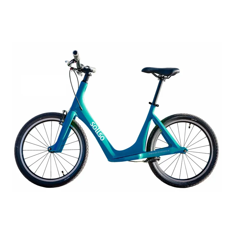 De Sollso Elan cyaan is een lichtgewicht carbon loopfiets met lage instap frame voor volwassenen. Deze Sollso Elan cyaan carbon loopfiets weegt slechts 5,2 kg en is daardoor zeer gemakkelijk handelbaar. De 20inch wielen rollen comfortabel en het zadel is naar wens af te stellen. De Sollso Elan cyaan carbon loopfiets is geschikt voor personen van 135 tot 175 cm en tot een gewicht van 100 kg. Voor personen boven de 175 cm of boven de 100 kg hebben we de Sollso Plus loopfiets beschikbaar. Voor extra gemak is de Sollso Elan cyaan carbon loopfiets voorzien van een stevige standaard zodat je hem gemakkelijk kunt parkeren. De Sollso Elan cyaan carbon loopfiets met carbon frame is designed in Duitsland en van extreem hoge kwaliteit.