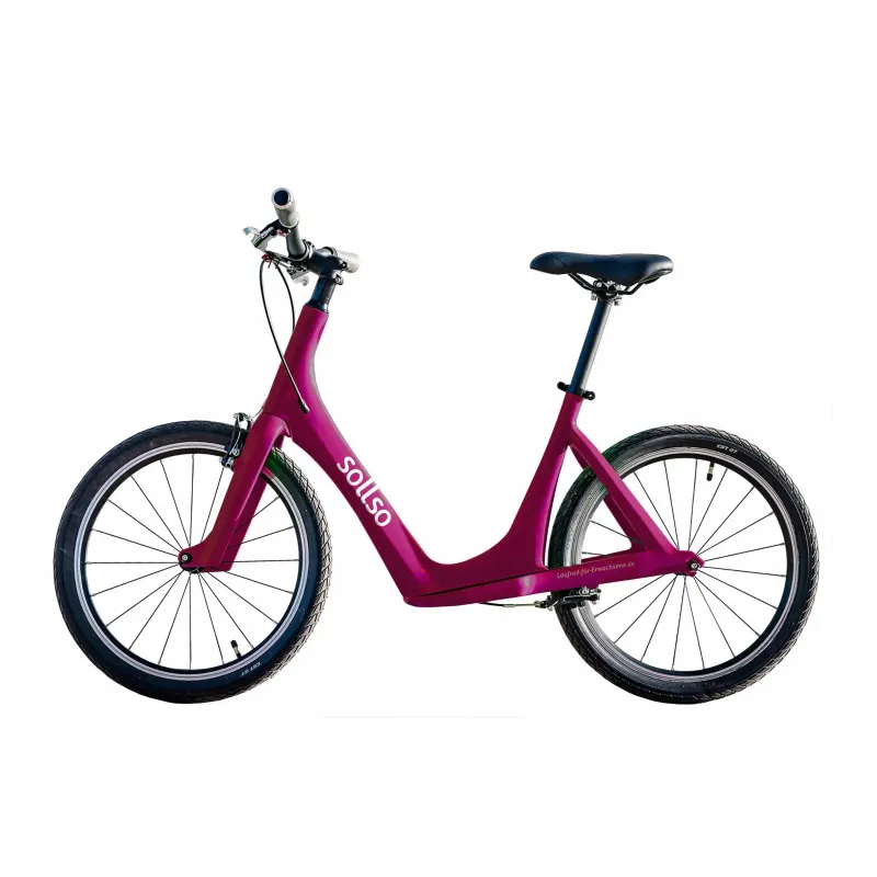 De Sollso Elan magenta is een lichtgewicht carbon loopfiets met lage instap frame voor volwassenen. Deze Sollso Elan magenta carbon loopfiets weegt slechts 5,2 kg en is daardoor zeer gemakkelijk handelbaar. De 20inch wielen rollen comfortabel en het zadel is naar wens af te stellen. De Sollso Elan magenta carbon loopfiets is geschikt voor personen van 135 tot 175 cm en tot een gewicht van 100 kg. Voor personen boven de 175 cm of boven de 100 kg hebben we de Sollso Plus loopfiets beschikbaar. Voor extra gemak is de Sollso Elan magenta carbon loopfiets voorzien van een stevige standaard zodat je hem gemakkelijk kunt parkeren. De Sollso Elan magenta carbon loopfiets met carbon frame is designed in Duitsland en van extreem hoge kwaliteit.