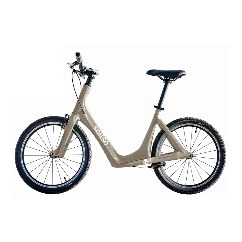 De Sollso Elan taupe is een lichtgewicht carbon loopfiets met lage instap frame voor volwassenen. Deze Sollso Elan taupe carbon loopfiets weegt slechts 5,2 kg en is daardoor zeer gemakkelijk handelbaar. De 20inch wielen rollen comfortabel en het zadel is naar wens af te stellen. De Sollso Elan taupe carbon loopfiets is geschikt voor personen van 135 tot 175 cm en tot een gewicht van 100 kg. Voor personen boven de 175 cm of boven de 100 kg hebben we de Sollso Plus loopfiets beschikbaar. Voor extra gemak is de Sollso Elan taupe carbon loopfiets voorzien van een stevige standaard zodat je hem gemakkelijk kunt parkeren. De Sollso Elan taupe carbon loopfiets met carbon frame is designed in Duitsland en van extreem hoge kwaliteit.