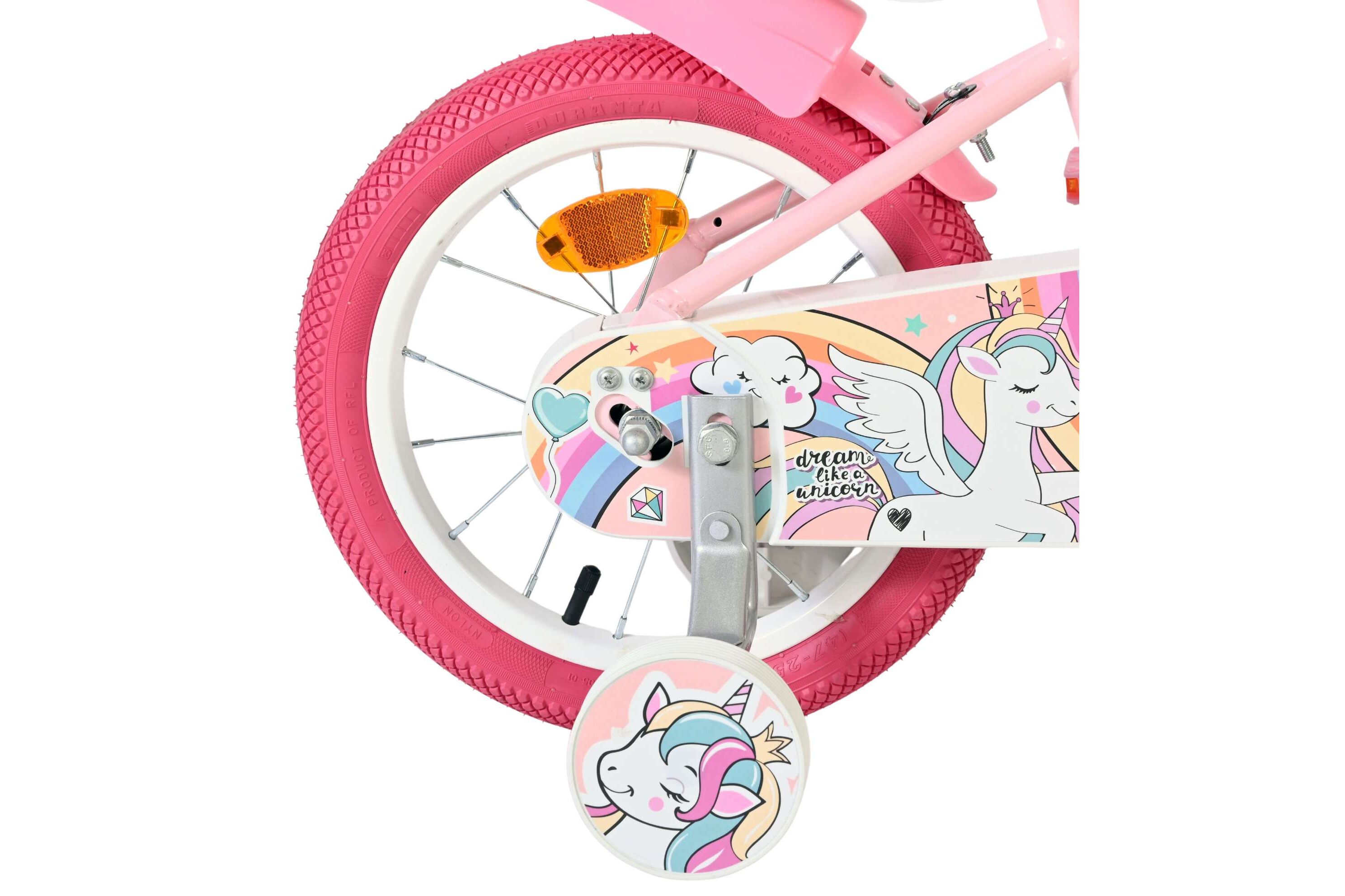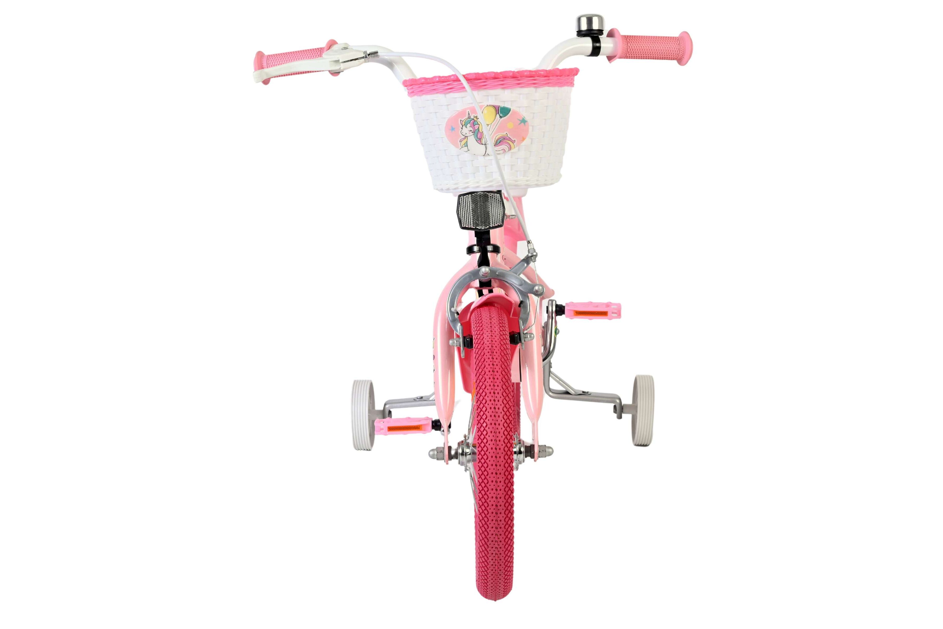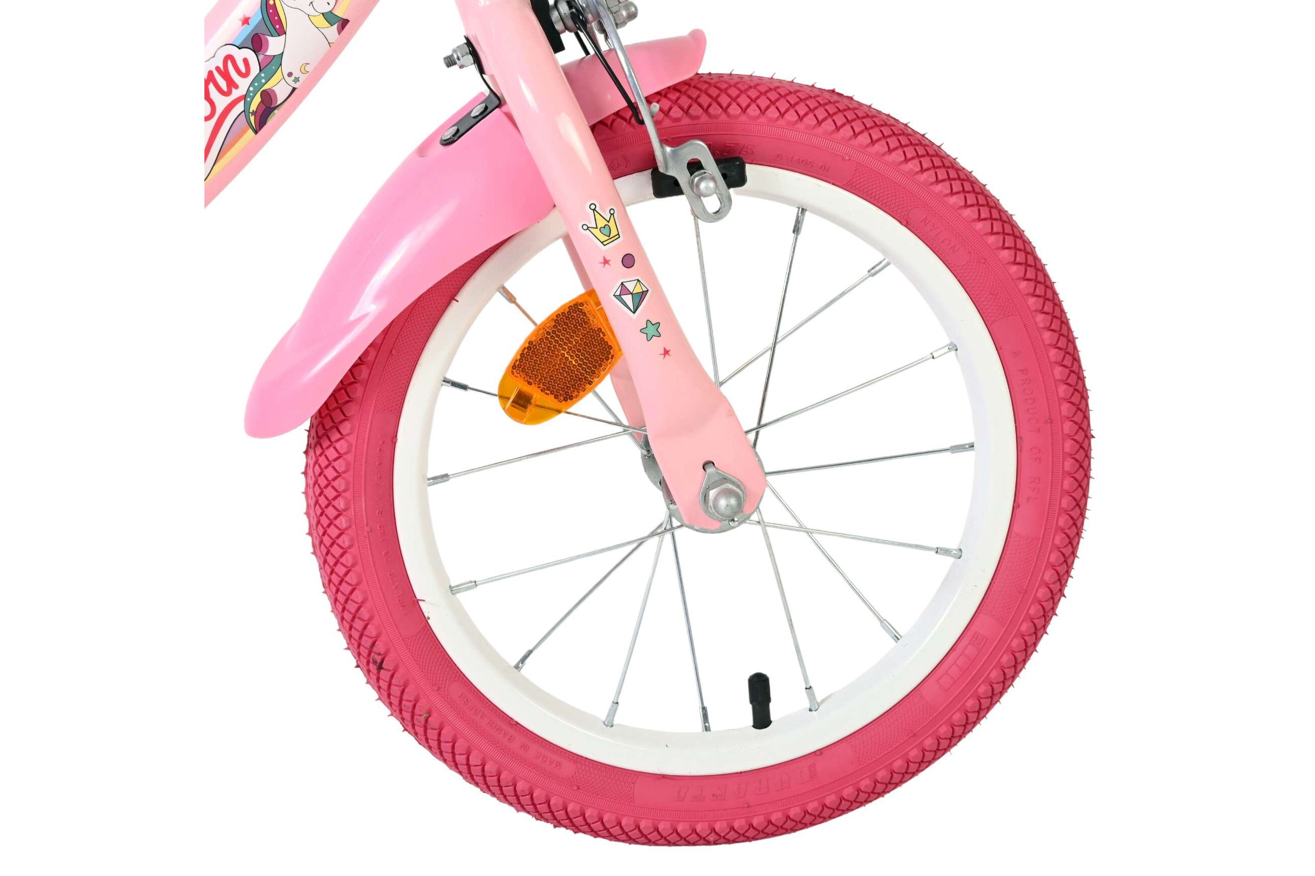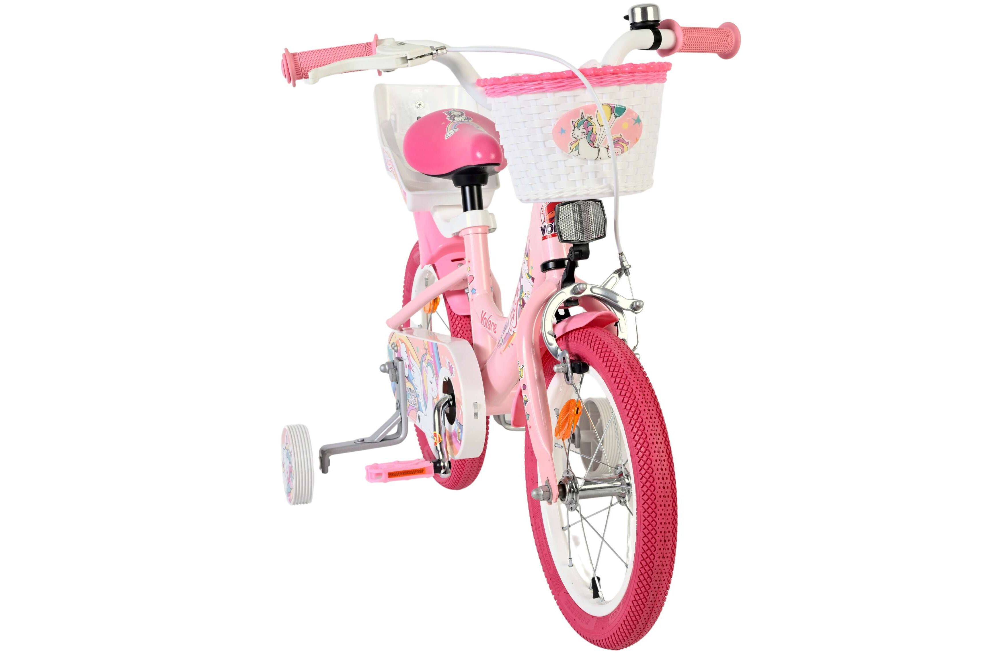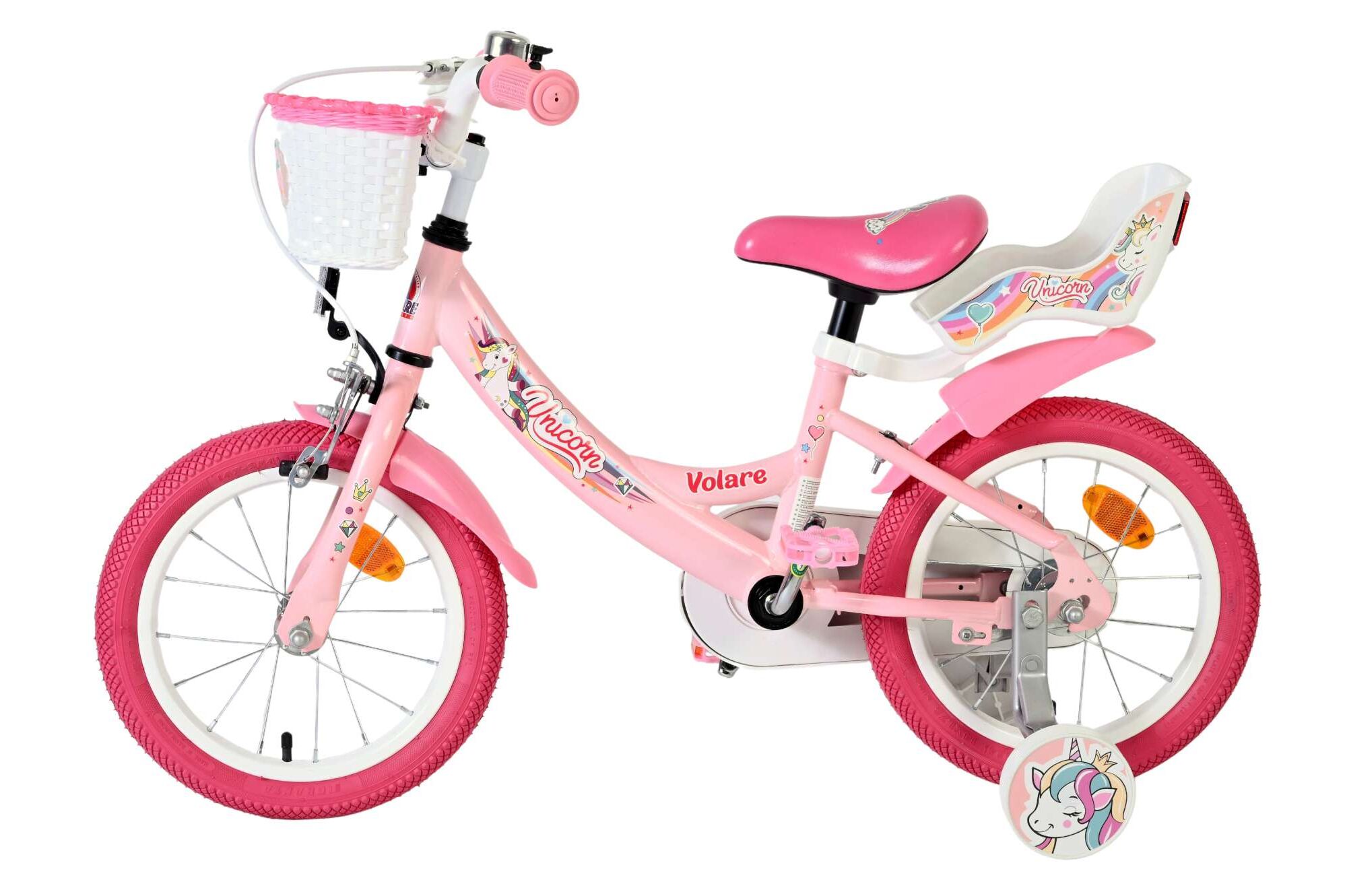 Deze Volare Unicorn is dé fiets waarop ieder meisje haar rit in een magisch avontuur omtovert. Met de zachte roze kleur en de Unicorn afbeeldingen is dit fietsje een echte blikvanger. In het poppenzitje achterop de Volare Unicorn kan de pop meegenomen worden, en in het fietsmandje voorop kunnen alle andere belangrijke spulletjes mee. Hierdoor kunnen uw kindjes de handjes veilig aan het stuur houden. Met de handrem en terugtraprem kan je snel stoppen en het zachte zadel en de handvaten van deze Volare Unicorn zorgen voor extra comfort en ter bescherming van de kleine vingertjes is de kettingkast gesloten. De afneembare zijwieltjes zorgen ervoor dat deze Volare Unicorn een ideale fiets is om snel en goed te kunnen leren fietsen. De 14 inch luchtbanden van deze Volare Unicorn fiets zorgen ervoor dat de fiets geschikt is voor meisjes tussen de 3,5 en 5 jaar oud met kledingmaat 98-110.