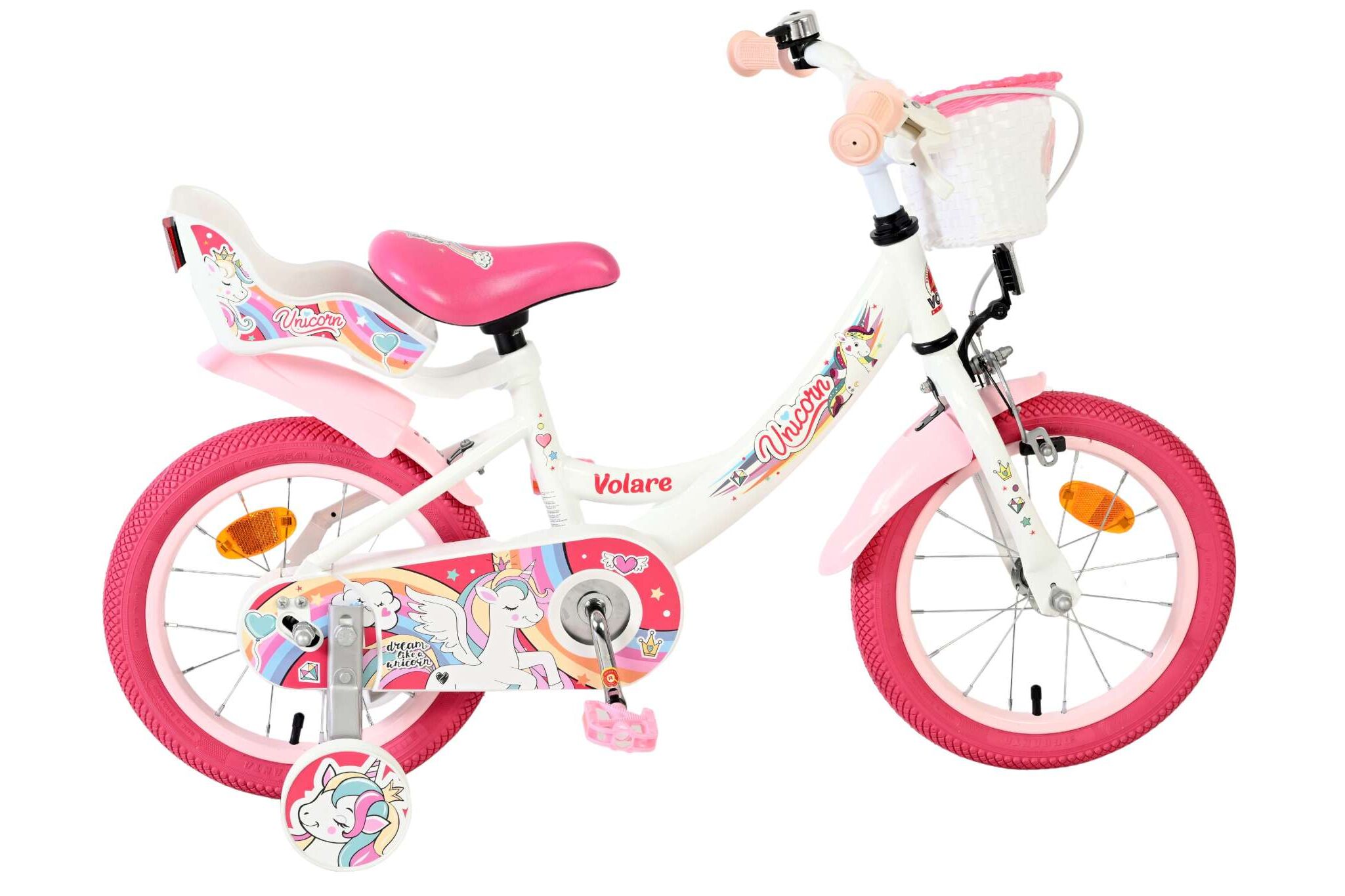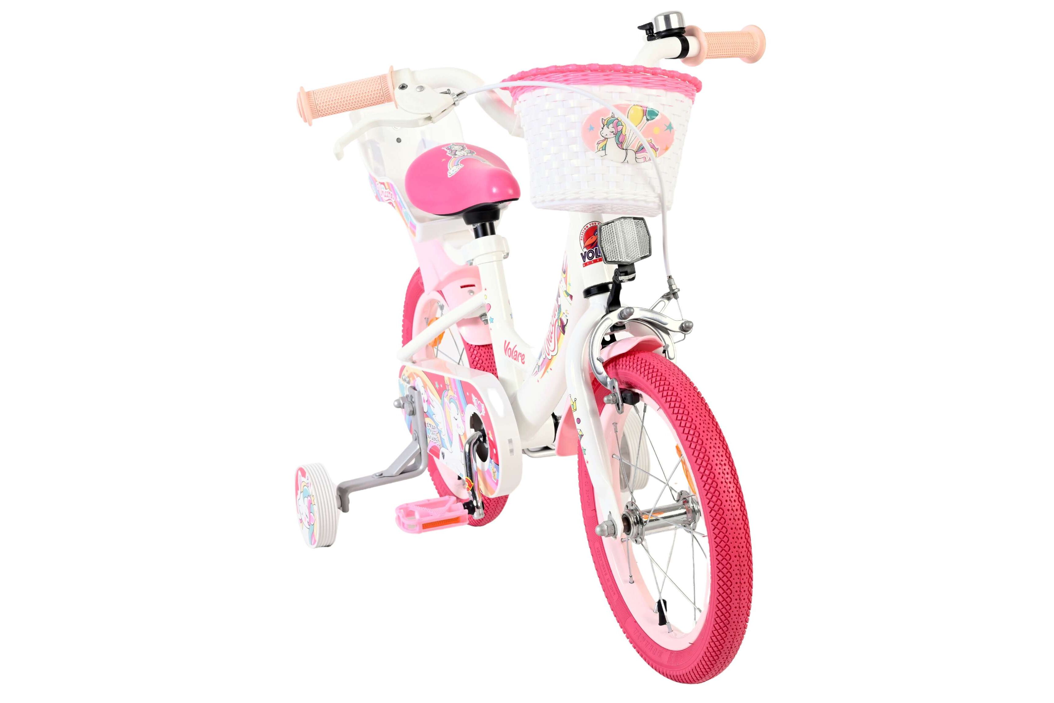 Deze Volare Unicorn is dé fiets waarop ieder meisje haar rit in een magisch avontuur omtovert. Met de frisse wit met roze kleur en de Unicorn afbeeldingen is dit fietsje een echte blikvanger. In het poppenzitje achterop de Volare Unicorn kan de pop meegenomen worden, en in het fietsmandje voorop kunnen alle andere belangrijke spulletjes mee. Hierdoor kunnen uw kindjes de handjes veilig aan het stuur houden. Met de handrem en terugtraprem kan je snel stoppen en het zachte zadel en de handvaten van deze Volare Unicorn zorgen voor extra comfort en ter bescherming van de kleine vingertjes is de kettingkast gesloten. De afneembare zijwieltjes zorgen ervoor dat deze Volare Unicorn een ideale fiets is om snel en goed te kunnen leren fietsen. De 14 inch luchtbanden van deze Volare Unicorn fiets zorgen ervoor dat de fiets geschikt is voor meisjes tussen de 3,5 en 5 jaar oud met kledingmaat 98-110.