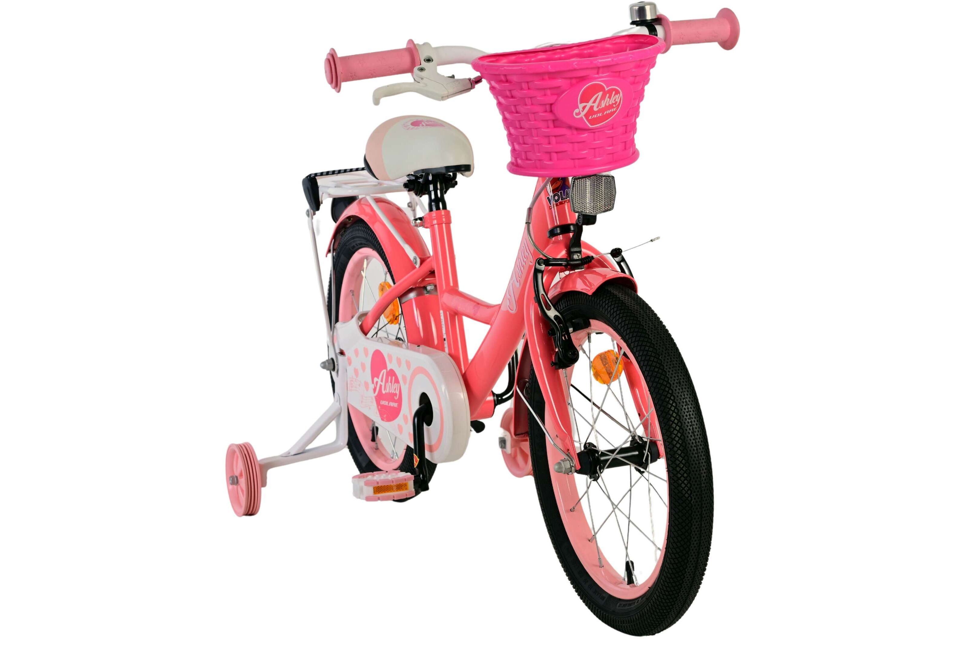 Deze beeldige Volare Ashley fiets is dé fiets die ieder meisje wil hebben. Op deze achterdrager en in het fietsmandje van de Volare Ashley kunnen alle belangrijke spulletjes mee worden genomen, waardoor uw kindjes veilig de handjes aan het stuur kunnen houden. Met de handrem en terugtraprem kan je snel stoppen en het zachte zadel en de handvaten van deze Volare Ashley zorgen voor extra comfort en ter bescherming van de kleine vingertjes is de kettingkast gesloten.De afneembare zijwieltjes zorgen ervoor dat deze Volare Ashley fiets een ideale fiets is om snel en goed te kunnen leren fietsen. De 16 inch luchtbanden van deze Volare Ashley fiets zorgen ervoor dat de fiets geschikt is voor meisjes tussen de 4 en 6 jaar oud met kledingmaat 104-110.