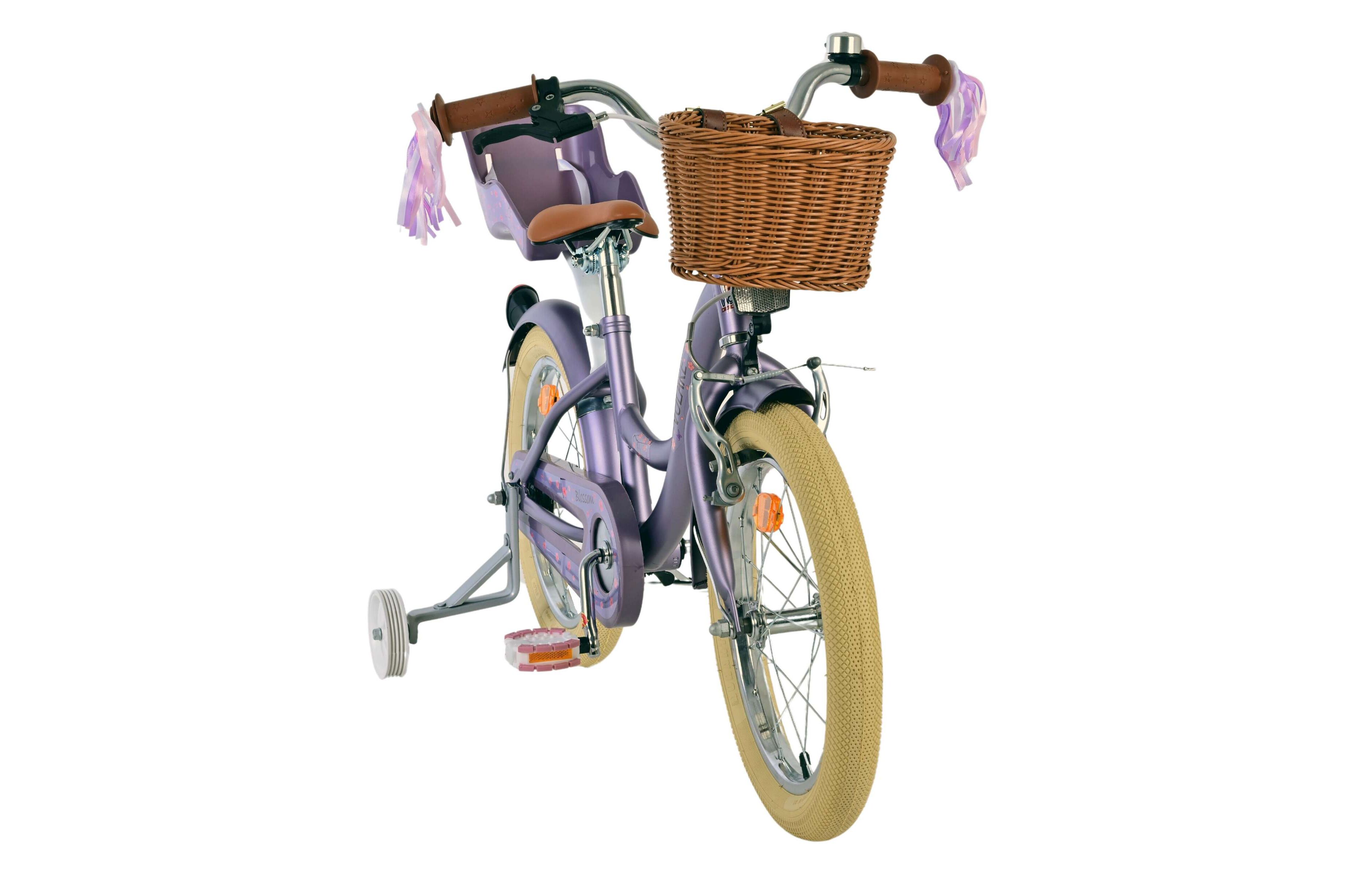 Deze beeldige Volare Blossem is dé fiets die ieder meisje wil hebben. In het poppenzitje achterop de Volare Blossem kan de pop meegenomen worden, en in het fietsmandje voorop kunnen alle andere belangrijke spulletjes mee worden genomen. Hierdoor kunnen uw kindjes de handjes veilig aan het stuur houden. Met de handrem en terugtraprem kan je snel stoppen en het zachte zadel en de handvaten van deze Volare Blossem zorgen voor extra comfort en ter bescherming van de kleine vingertjes is de kettingkast gesloten. De vrolijke stuurslingertjes maken het fietsje extra leuk. De afneembare zijwieltjes zorgen ervoor dat deze Volare Blossem fiets een ideale fiets is om snel en goed te kunnen leren fietsen. De 16 inch luchtbanden van deze Volare Blossem fiets zorgen ervoor dat de fiets geschikt is voor meisjes tussen de 4 en 6 jaar oud met kledingmaat 104 -110.