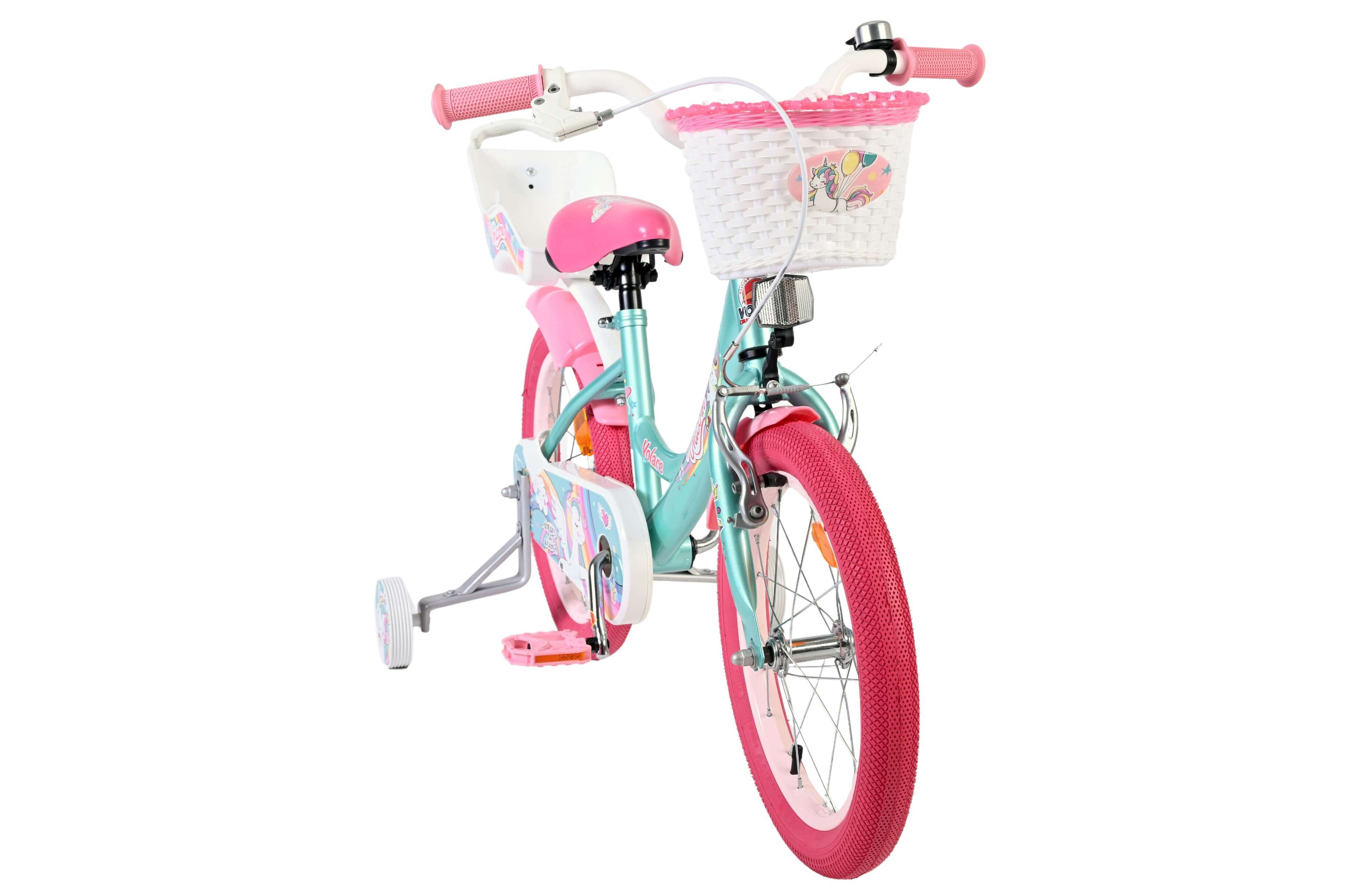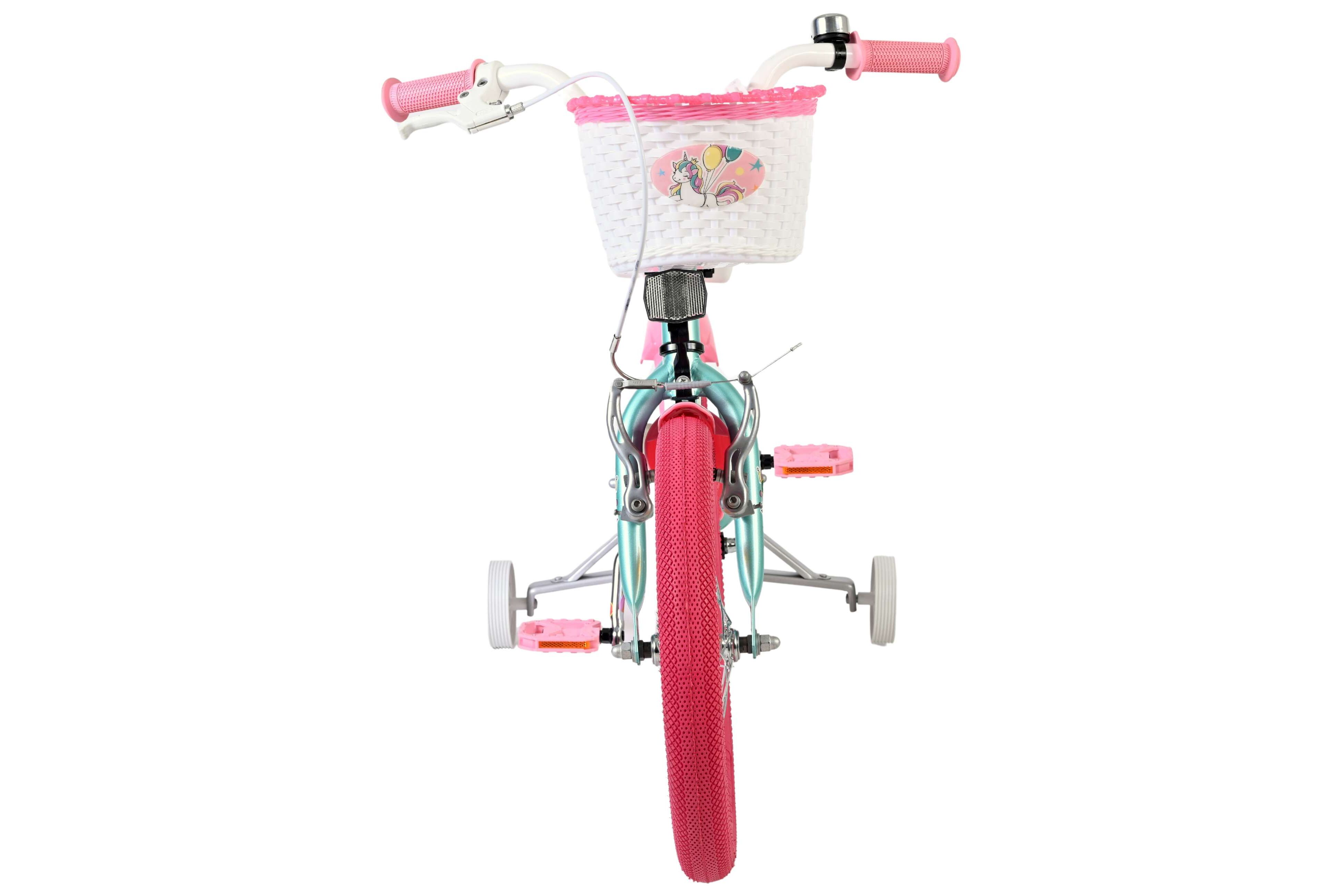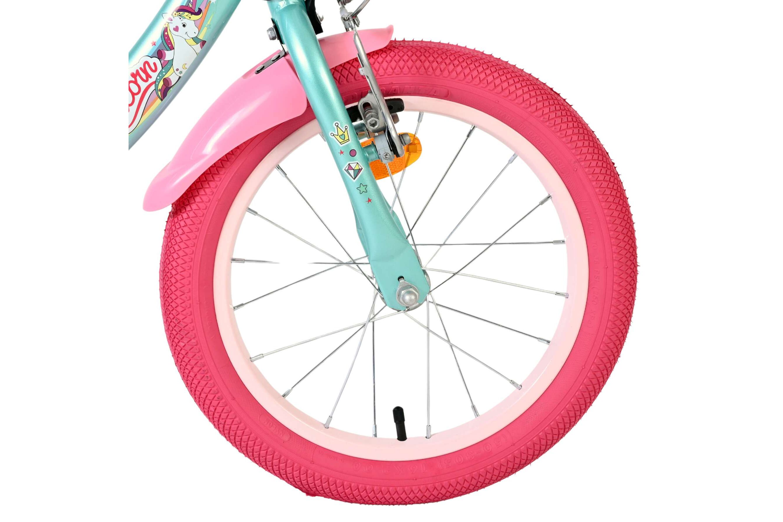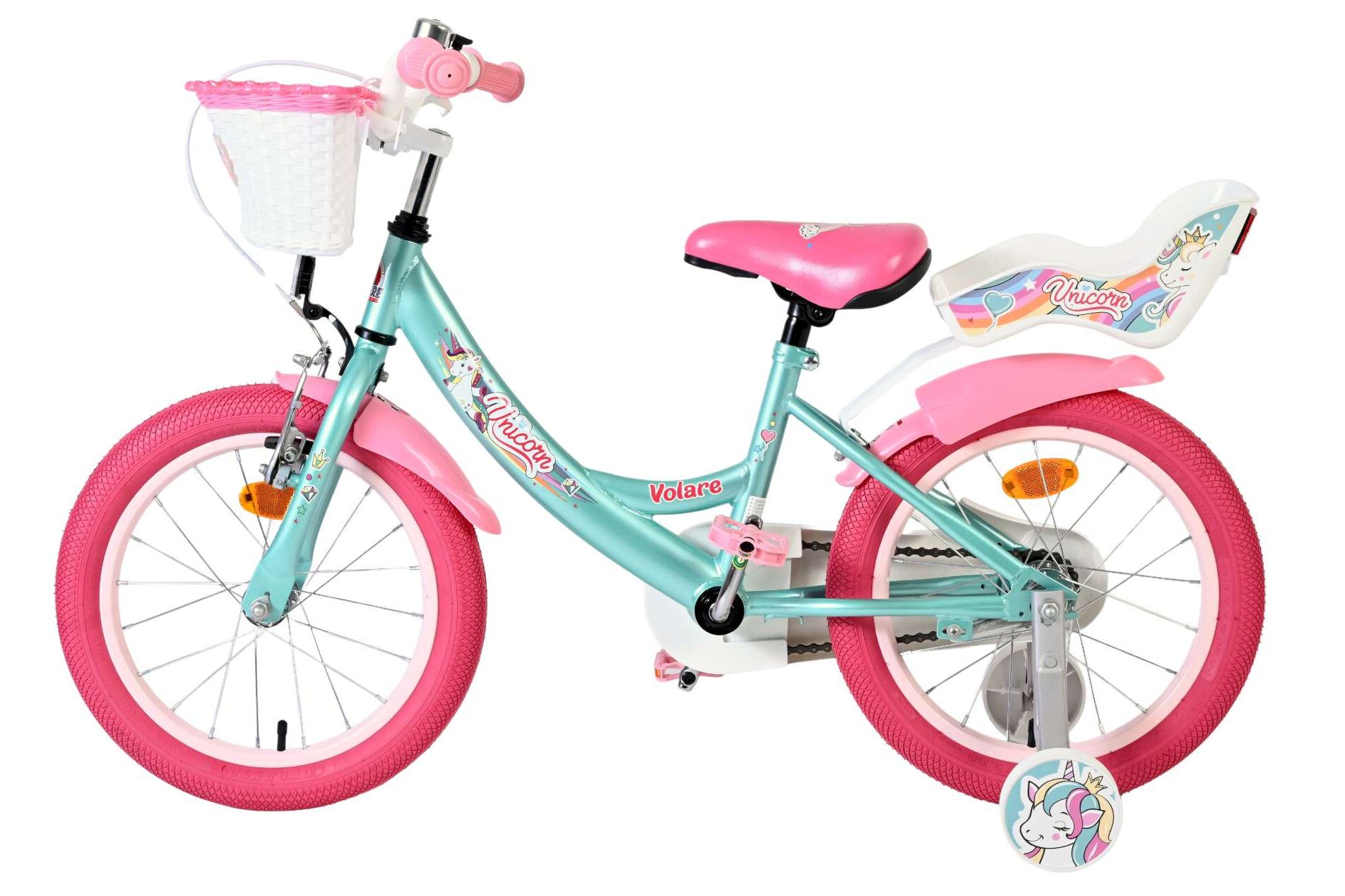 Deze Volare Unicorn is dé fiets waarop ieder meisje haar rit in een magisch avontuur omtovert. Met de frisse groene kleur en de Unicorn afbeeldingen is dit fietsje een echte blikvanger. In het poppenzitje achterop de Volare Unicorn kan de pop meegenomen worden, en in het fietsmandje voorop kunnen alle andere belangrijke spulletjes mee. Hierdoor kunnen uw kindjes de handjes veilig aan het stuur houden. Met de handrem en terugtraprem kan je snel stoppen en het zachte zadel en de handvaten van deze Volare Unicorn zorgen voor extra comfort en ter bescherming van de kleine vingertjes is de kettingkast gesloten. De afneembare zijwieltjes zorgen ervoor dat deze Volare Unicorn een ideale fiets is om snel en goed te kunnen leren fietsen. De 16 inch luchtbanden van deze Volare Unicorn fiets zorgen ervoor dat de fiets geschikt is voor meisjes tussen de 4 en 6 jaar oud met kledingmaat 104-116.