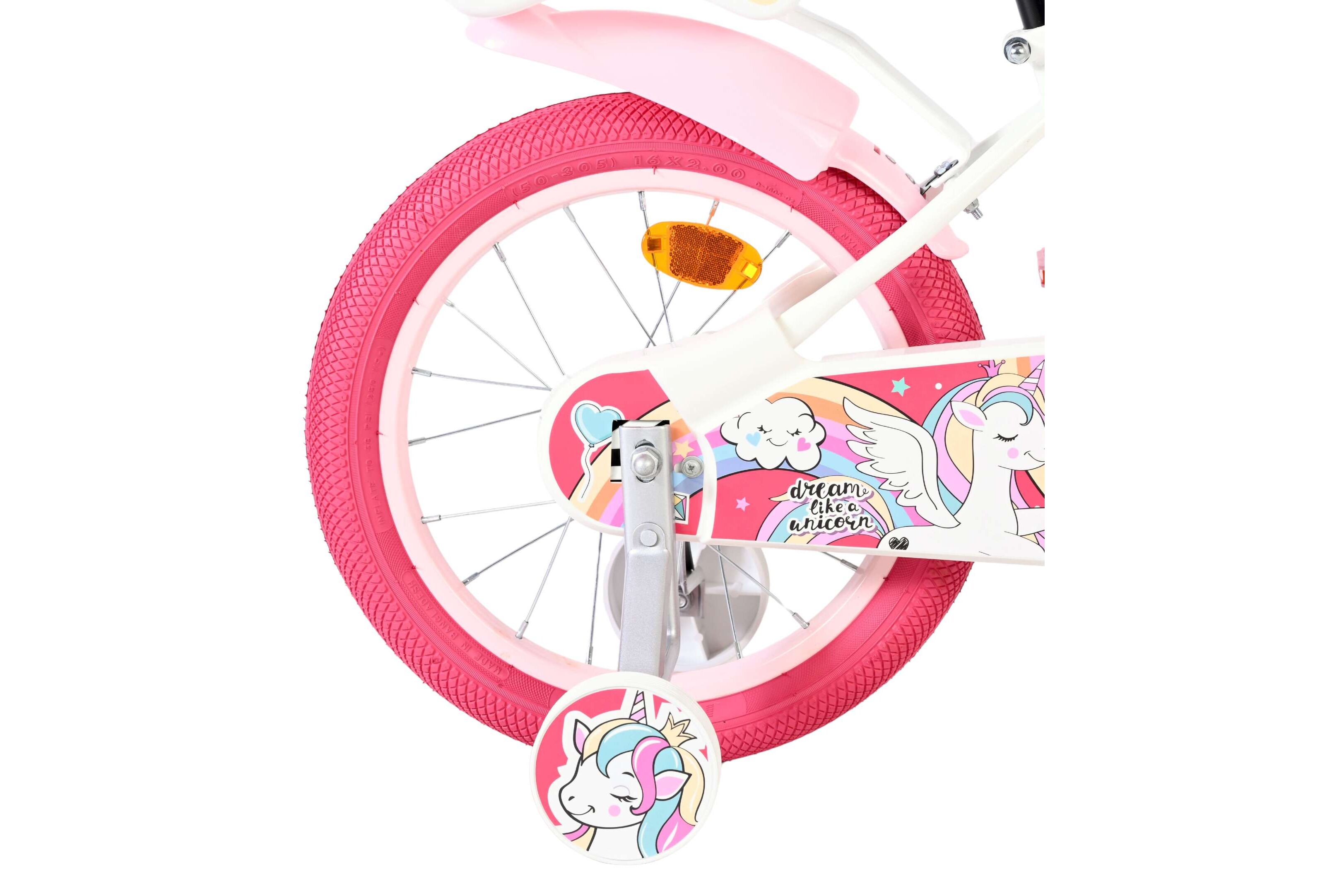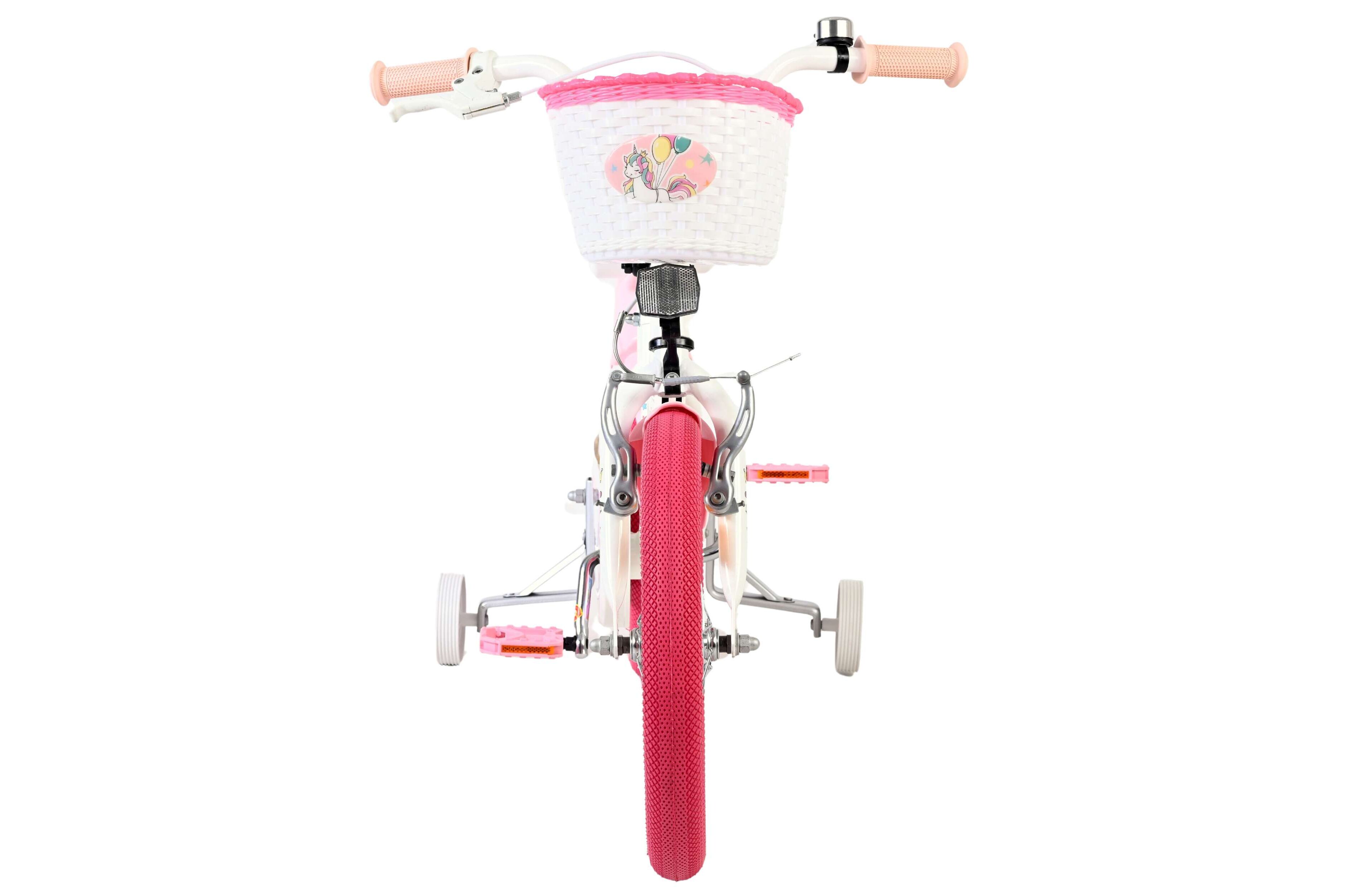 Deze Volare Unicorn is dé fiets waarop ieder meisje haar rit in een magisch avontuur omtovert. Met de frisse witte kleur en de roze Unicorn afbeeldingen is dit fietsje een echte blikvanger. In het poppenzitje achterop de Volare Unicorn kan de pop meegenomen worden, en in het fietsmandje voorop kunnen alle andere belangrijke spulletjes mee. Hierdoor kunnen uw kindjes de handjes veilig aan het stuur houden. Met de handrem en terugtraprem kan je snel stoppen en het zachte zadel en de handvaten van deze Volare Unicorn zorgen voor extra comfort en ter bescherming van de kleine vingertjes is de kettingkast gesloten. De afneembare zijwieltjes zorgen ervoor dat deze Volare Unicorn een ideale fiets is om snel en goed te kunnen leren fietsen. De 16 inch luchtbanden van deze Volare Unicorn fiets zorgen ervoor dat de fiets geschikt is voor meisjes tussen de 4 en 6 jaar oud met kledingmaat 104-116.